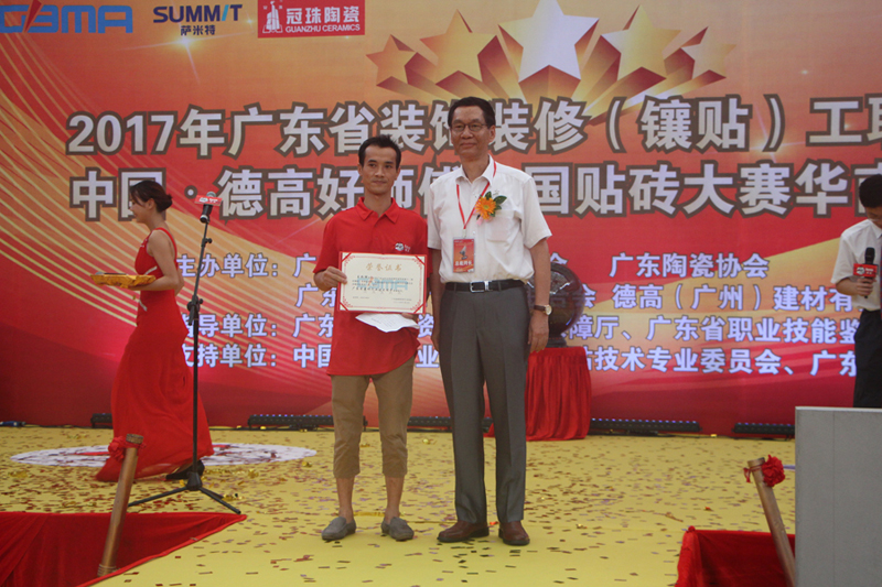 广东省装饰装修(镶贴)工职业技能竞赛是一次行业性技能比武练兵活动。本次比赛由广东省建筑材料行业协会、广东陶瓷协会、广东省建材行业工会联合会和德高(广州)建材有限公司联合主办,并被列入广东省职业技能竞赛二类比赛,得到了广东省人力资源和社会保障厅、广东省职业技能鉴定指导中心协助指导,并获得广东新明珠集团有限公司、中国陶瓷工业协会瓷砖粘贴技术专业委员会的大力支持。