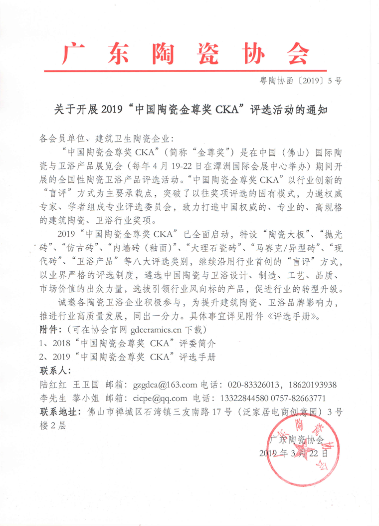关于开展2019“中国陶瓷金尊奖CKA”评选活动的通知