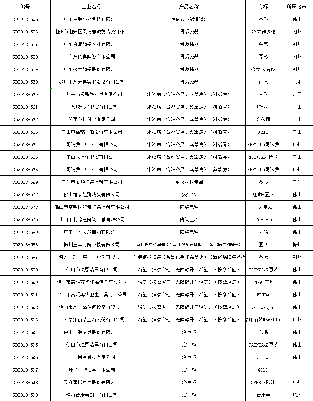 2018年陶瓷机械、陶瓷、卫浴相关类名牌产品名单