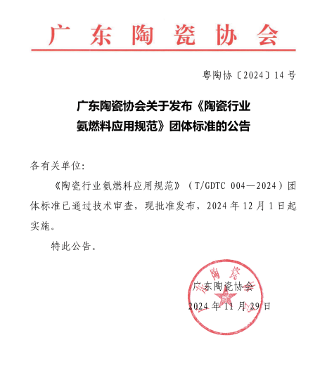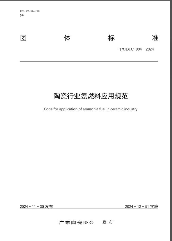 陶瓷行业氨燃料应用规范T/GDTC 004—2024)团体标准已通过技术审查,现批准发布,2024121日起实施。