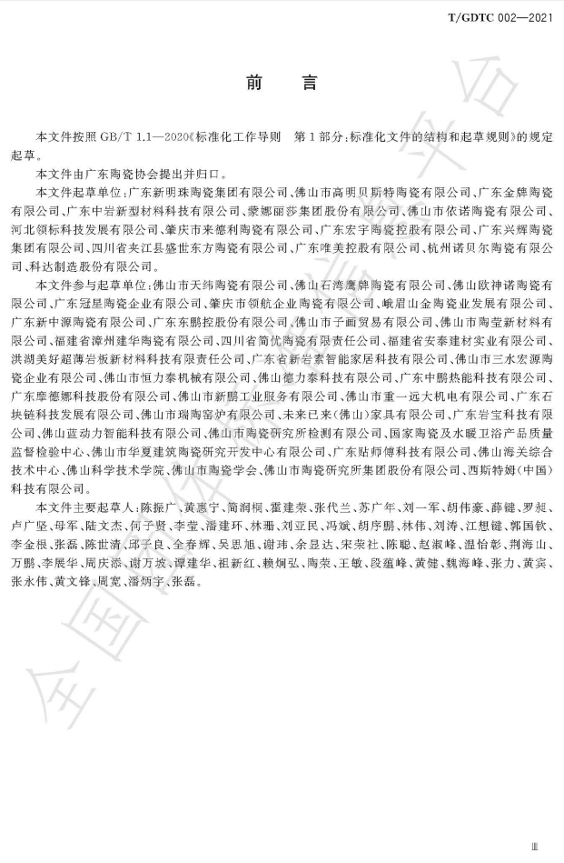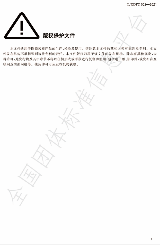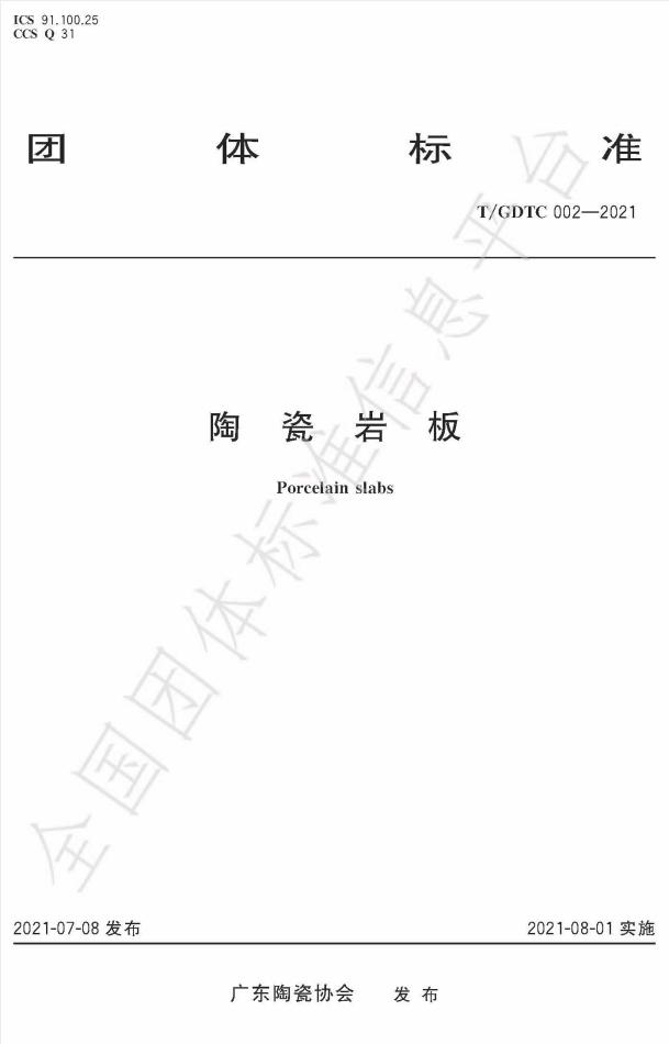 日前,由广东陶瓷协会牵头组织,50多家单位参与编写的《陶瓷岩板》(T/GDTC 002-2021)团体标准经审查、批准,于2021年7月8日正式发布,自2021年8月1日起实施。