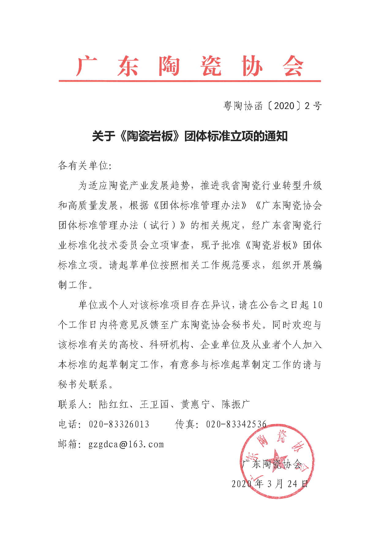 为适应陶瓷产业发展趋势,推进我省陶瓷行业转型升级和高质量发展,根据《团体标准管理办法》广东陶瓷协会团体标准管理办法(试行)的相关规定,经广东省陶瓷行业标准化技术委员会立项审查,现予批准《陶瓷岩板》团体标准立项。请起草单位按照相关工作规范要求,组织开展编制工作。