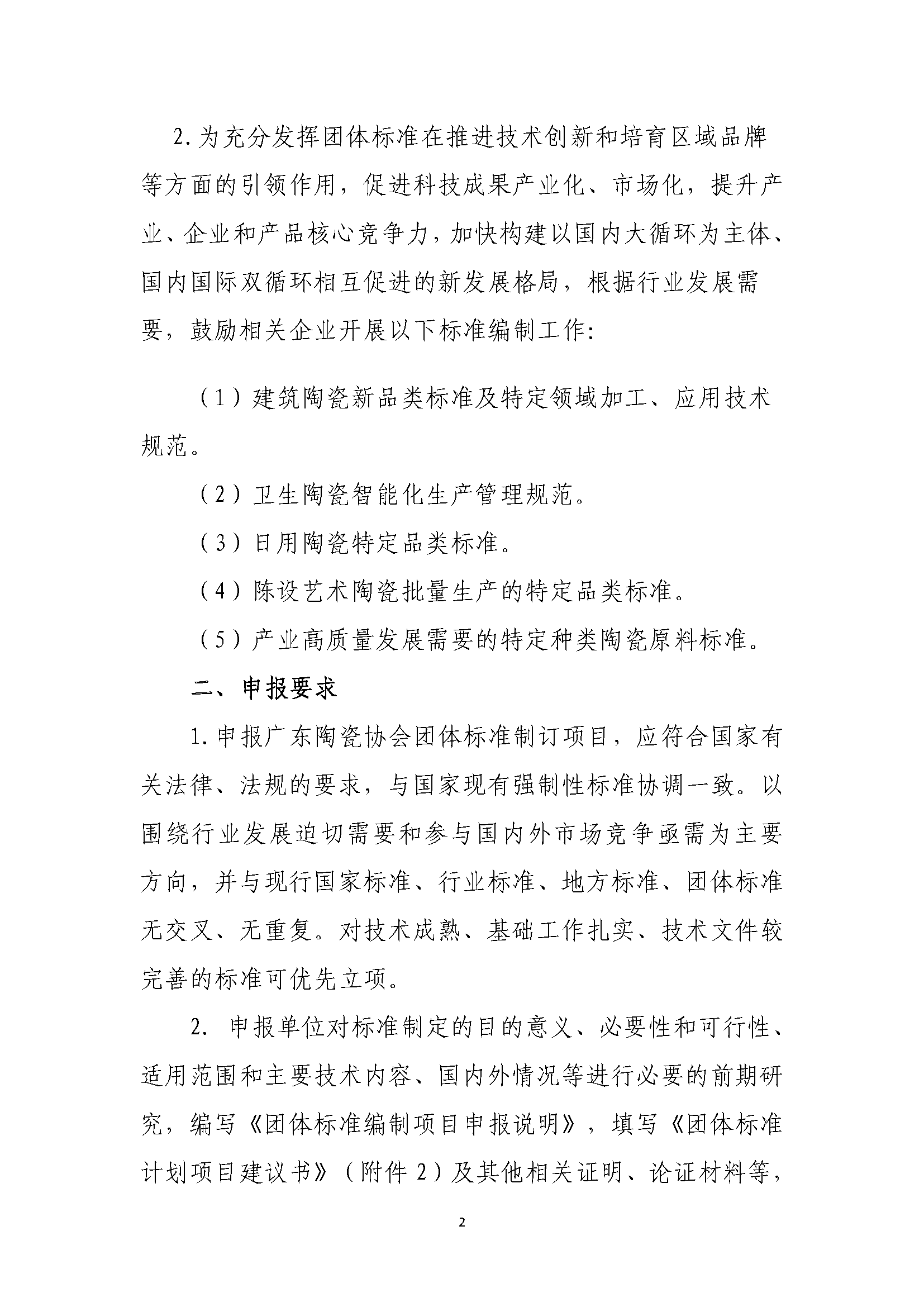 1.申报广东陶瓷协会团体标准制订项目,应符合国家有关法律、法规的要求,与国家现有强制性标准协调一致。以围绕行业发展迫切需要和参与国内外市场竞争亟需为主要方向,并与现行国家标准、行业标准、地方标准、团体标准无交叉、无重复。对技术成熟、基础工作扎实、技术文件较完善的标准可优先立项。