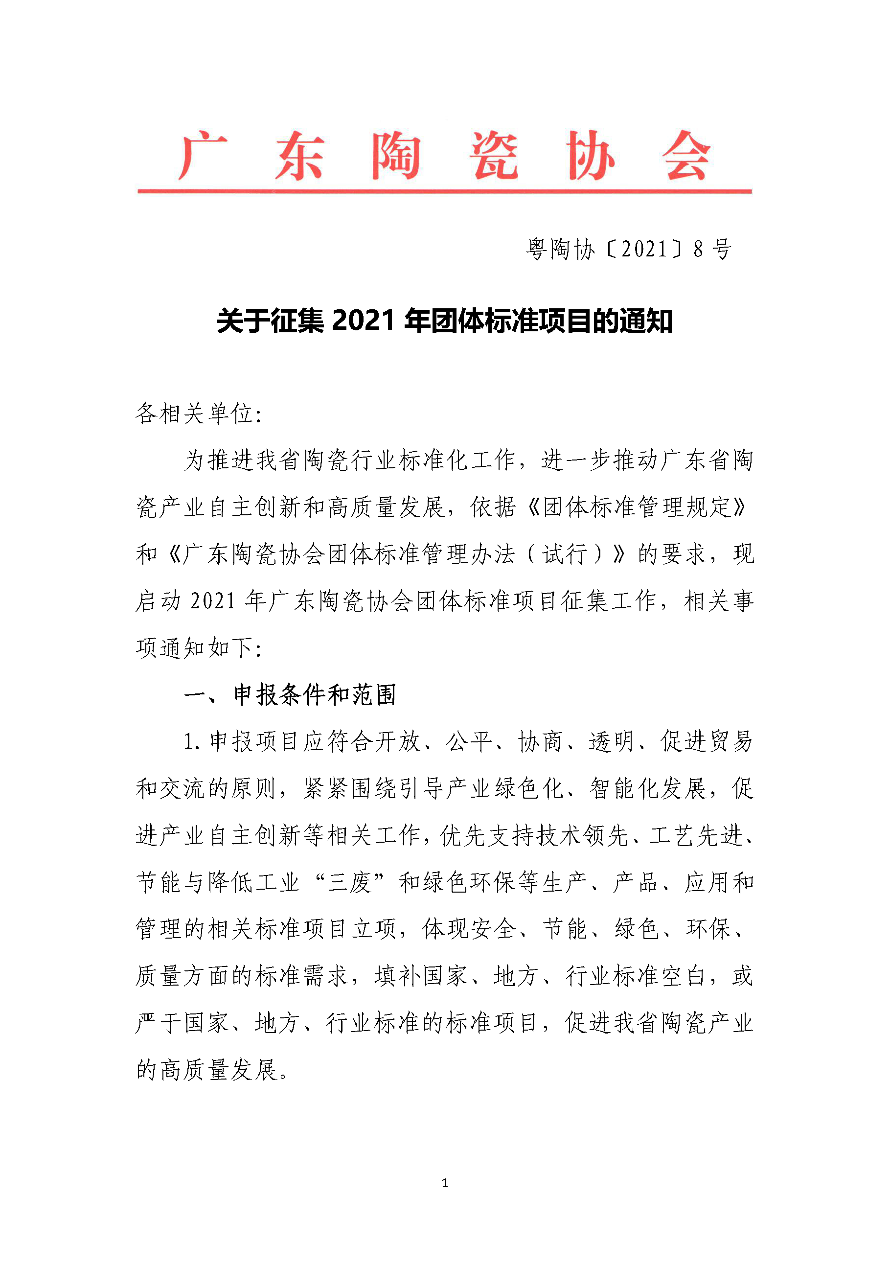 为推进我省陶瓷行业标准工作,进一步推动广东省陶瓷产业自主创新和高质量发展,依据《团体标准管理规定》和《广东陶瓷协会团体标准管理办法(试行)》的要求,现启动2021年广东陶瓷协会团体标准项目征集工作,相关事项通知如下:
