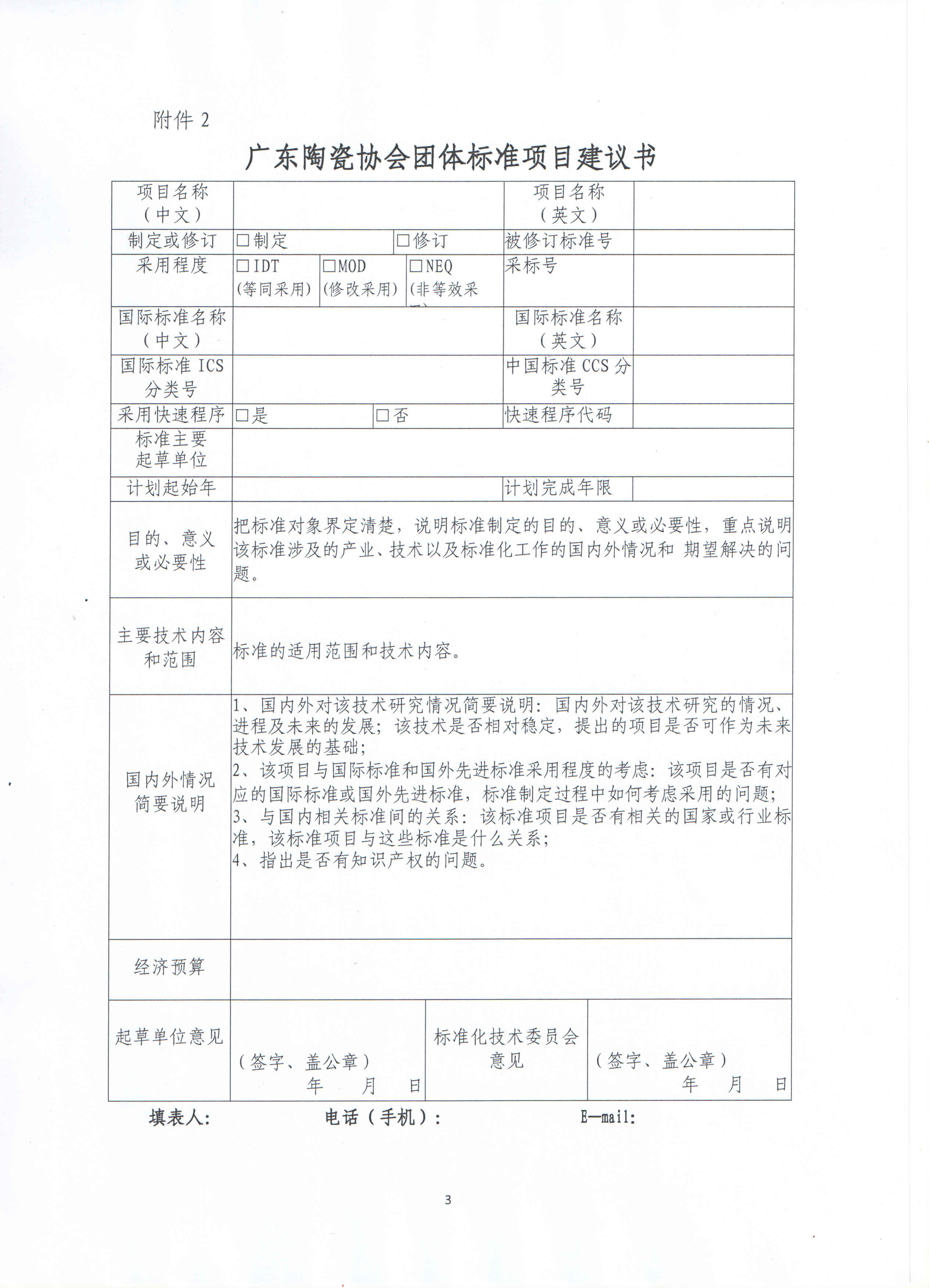 2. 申报单位对标准制定的目的意义、必要性和可行性、适用范围和主要技术内容、国内外情况等进行必要的前期研究,填写《团体标准项目建议书》(附件1)及其他相关证明、论证材料等,以电子版和纸质版的形式报送至协会秘书处。