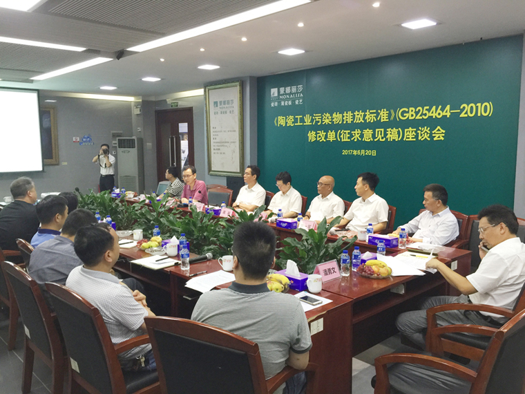 6月20日下午,广东陶瓷协会在佛山西樵蒙娜丽莎召开座谈会,就环保部《陶瓷工业污染物排放标准》(GB 25464-2010)修改单(征求意见稿)进行讨论、分析,以形成综合意见建议向环保部反馈。来自佛山、清远、肇庆、江门、东莞等产区的建筑卫生陶瓷骨干企业环保负责人及佛山市陶瓷协会、佛山市建材行业协会、环保局的代表参加了座谈会。广东陶瓷协会会长陈环、广东省建材协会创会会长/首席专家吴一岳、蒙娜丽莎集团副董事长霍荣铨、副总裁刘一军等领导出席座谈会。会议由广东陶瓷协会秘书长陈振广主持。