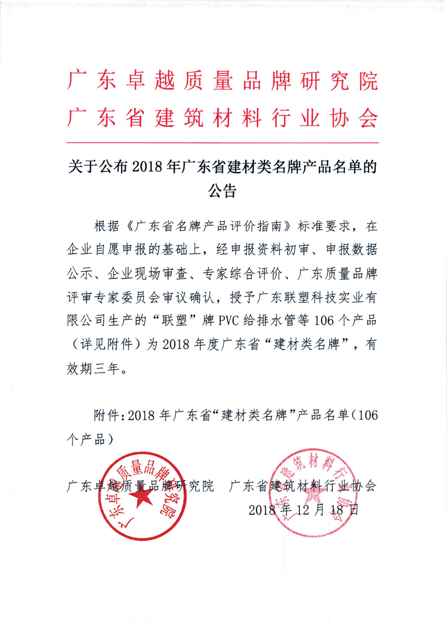 12月19日,广东卓越质量品牌研究院与广东省建材行业协会联合发布《关于公布2018年广东省建材类名牌产品名单的公告》,根据《广东省名牌产品评价指南》标准要求,在企业自愿申报的基础上,经申报资料初审、申报数据公示、企业现场审查、专家综合评价、广东质量品牌评审专家委员会审议确认,授予广东联塑科技实业有限公司生产的 “联塑”牌PVC给排水管等106个产品为2018年度广东省建材类名牌,有效期三年。