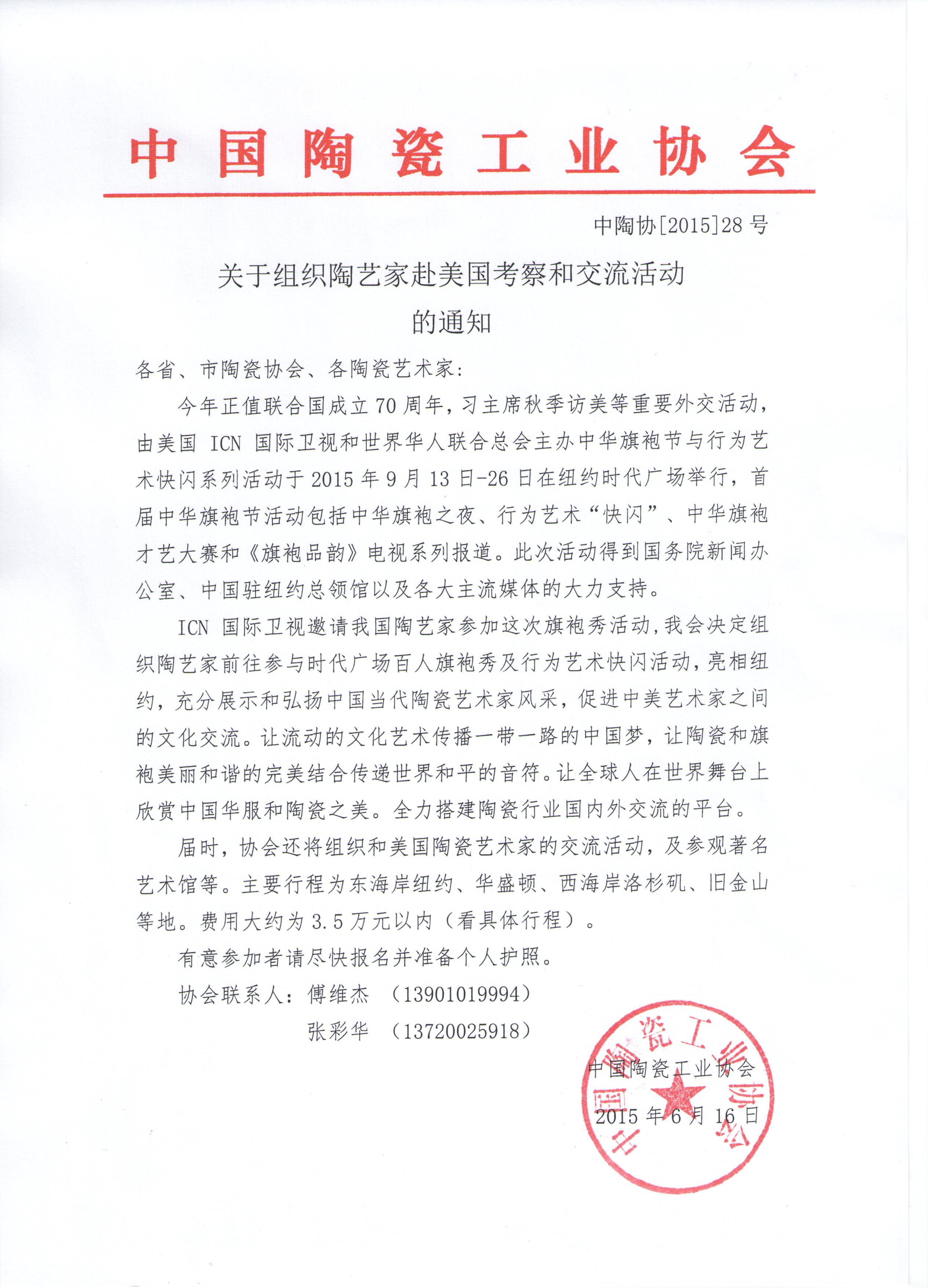 转发中国陶瓷工业协会《关于组织陶艺家赴美国考察和交流活动的通知》。