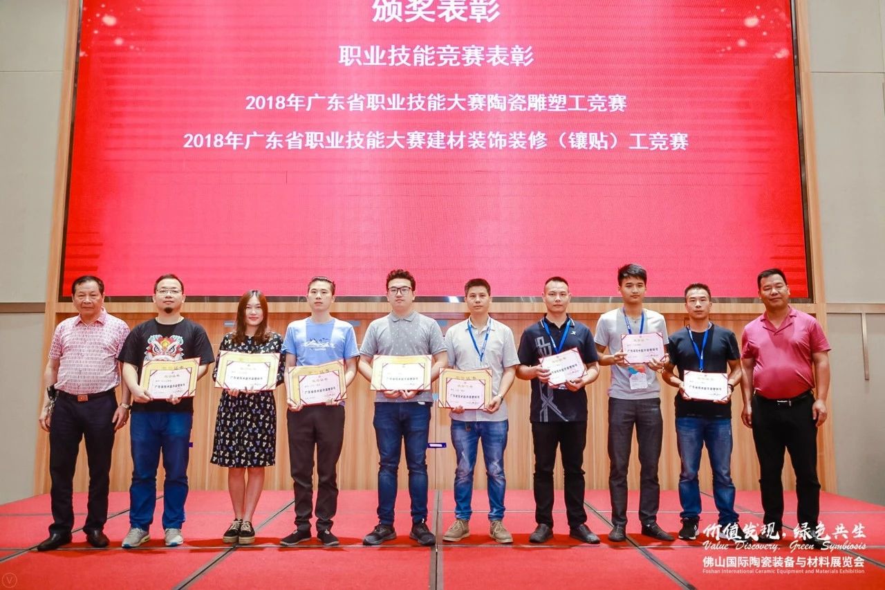 大会为2018年广东省职业技能大赛陶瓷雕塑工、装饰装修(镶贴)工竞赛优胜选手颁发“广东省技术能手”等荣誉证书;为广东陶瓷专家俱乐部专家授牌; 进行第十一届广东省陶瓷艺术创作设计创新作品评选暨第九届广东省陶瓷艺术精品展颁证;为陶瓷行业绿色制造指数首批示范试点企业授牌。