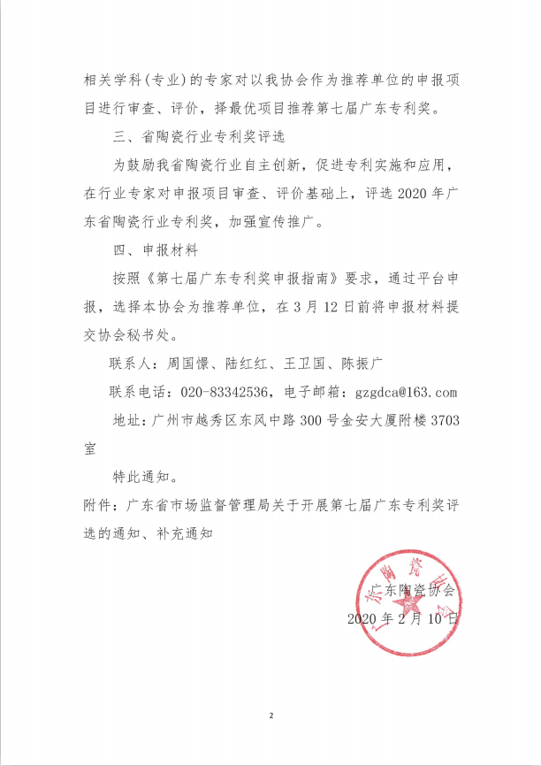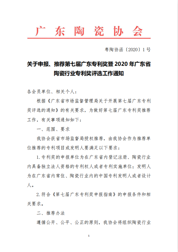 关于申报、推荐第七届广东专利奖暨 2020 年广东省 陶瓷行业专利奖评选工作通知