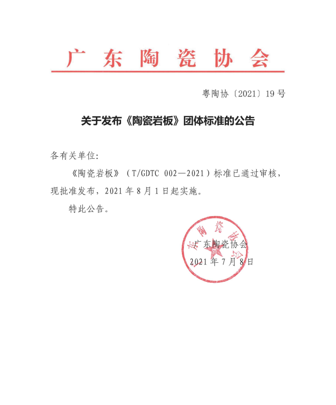 日前,由广东陶瓷协会牵头组织,50多家单位参与编写的《陶瓷岩板》(T/GDTC 002-2021)团体标准经审查、批准,于2021年7月8日正式发布,自2021年8月1日起实施。