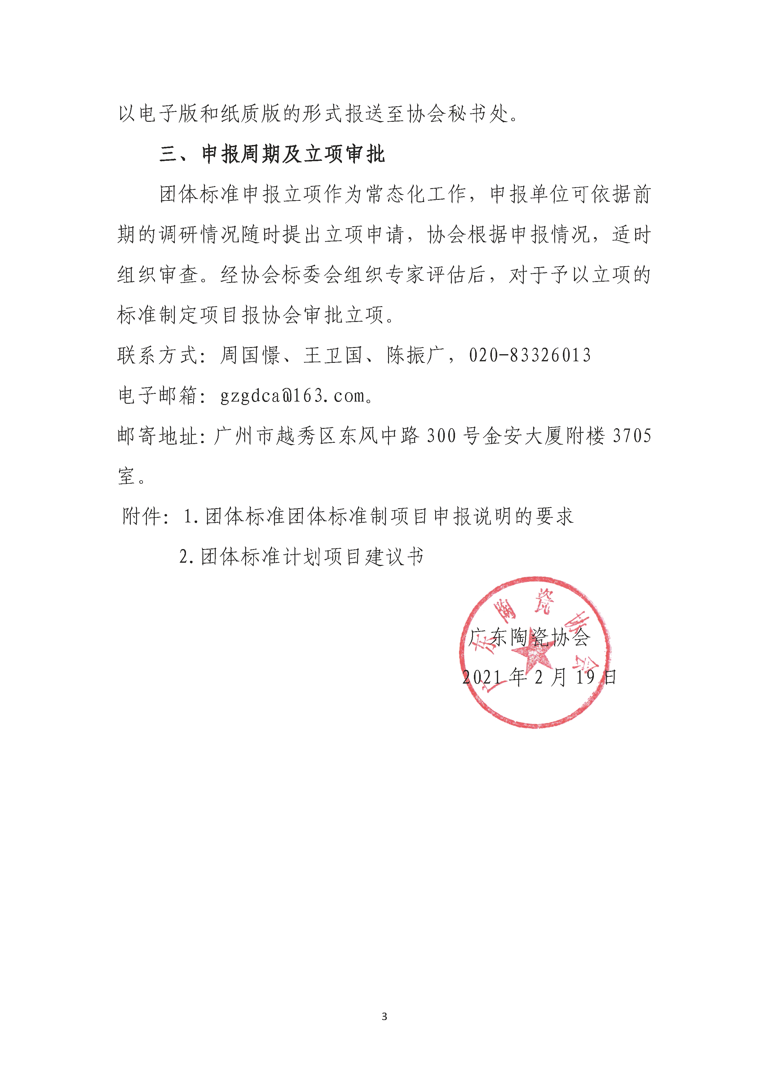 为推进我省陶瓷行业标准工作,进一步推动广东省陶瓷产业自主创新和高质量发展,依据《团体标准管理规定》和《广东陶瓷协会团体标准管理办法(试行)》的要求,现启动2021年广东陶瓷协会团体标准项目征集工作,相关事项通知如下: