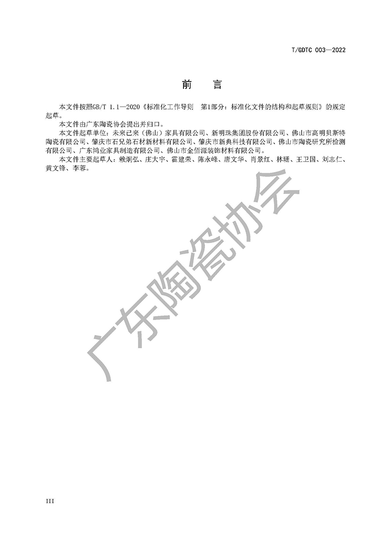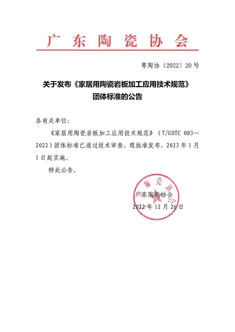 《家居用陶瓷岩板加工应用技术规范》(T/GDTC 003—2022)团体标准已通过技术审查,现批准发布,2023年1月1日起实施。