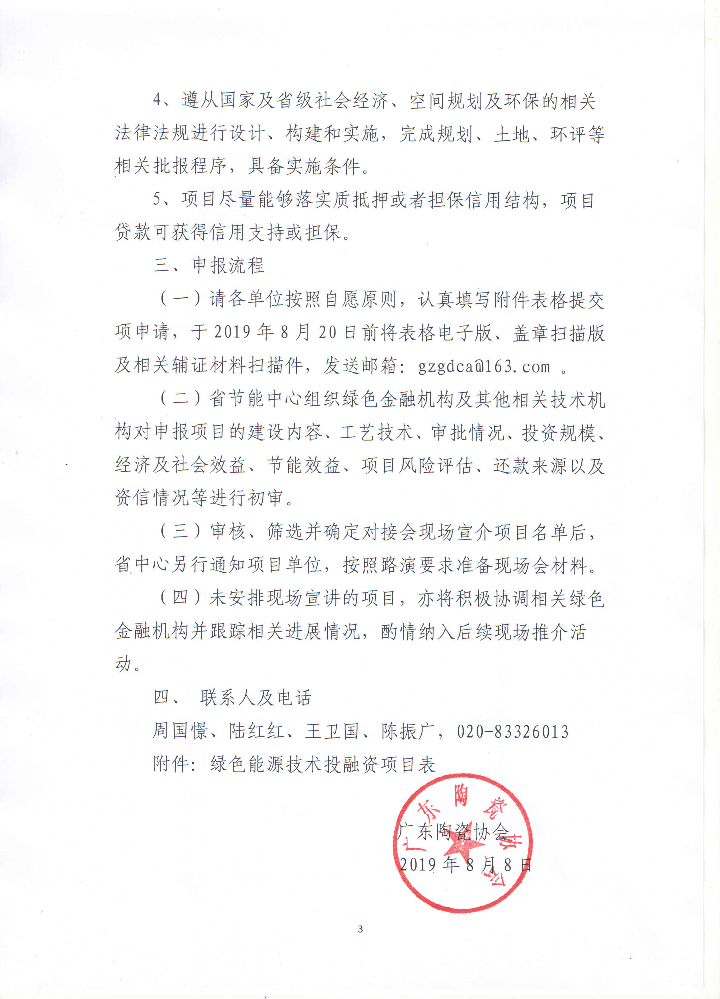 为贯彻党的十九大和习近平总书记系列重要讲话精神,落实《粤港澳大湾区发展规划纲要》中“创新绿色低碳发展模式”、“大力发展绿色金融产业”等相关要求,培育壮大新能源、节能产业,采用先进适用节能技术改造提升传统产业,加快构建绿色产业体系,广东省节能中心计划于9-10月份召开2019年广东省第二届重点节能技术推广和项目对接会活动,目前已联系绿色金融机构约350亿规模的资金面,竭诚为绿色能源领域企业提供服务。现广泛征集项目需求,请大家填报项目作储备,有关事项通知如下: