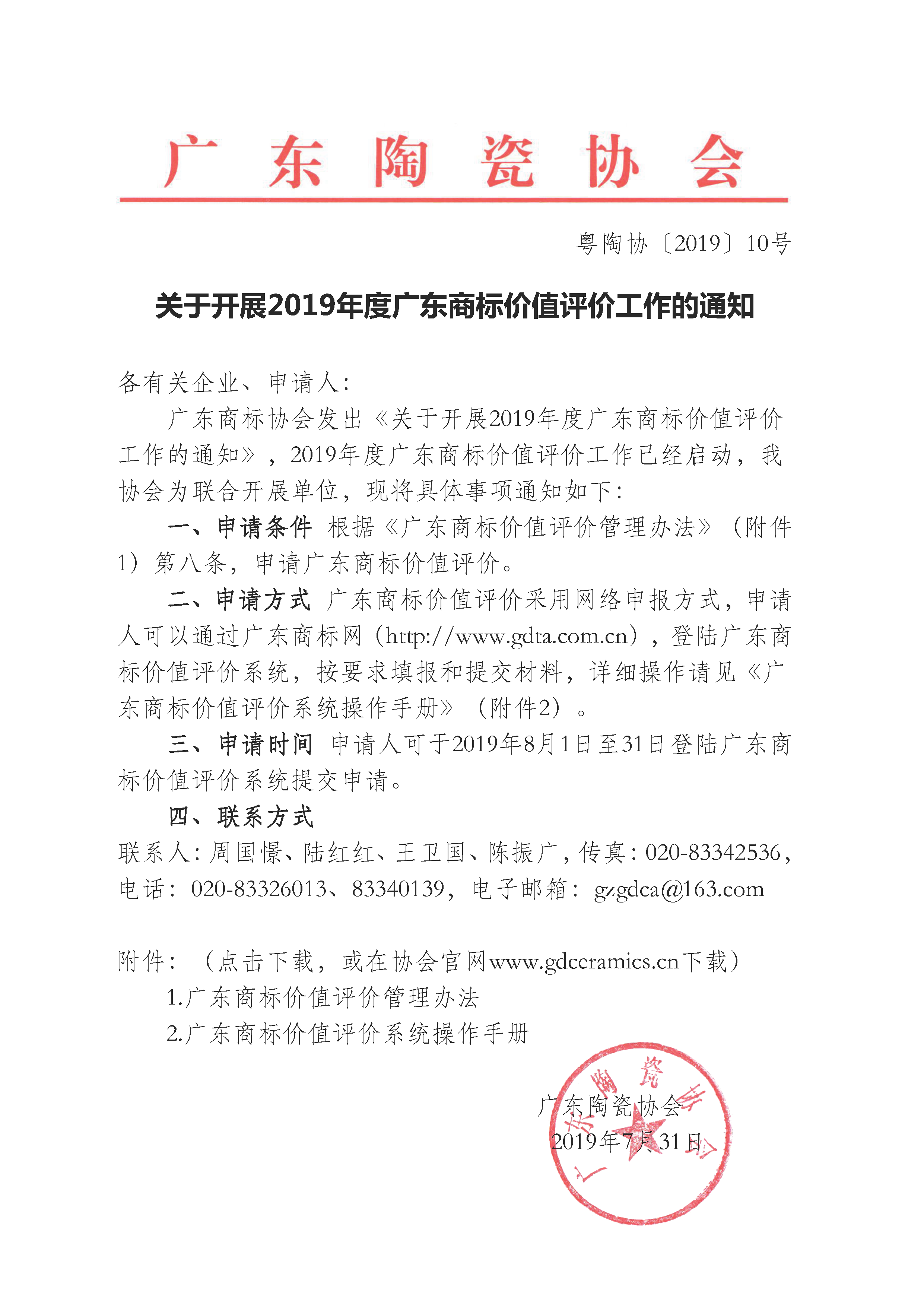 广东商标协会发出《关于开展2019年度广东商标价值评价工作的通知》,2019年度广东商标价值评价工作已经启动,我协会为联合开展单位,现将具体事项通知如下: