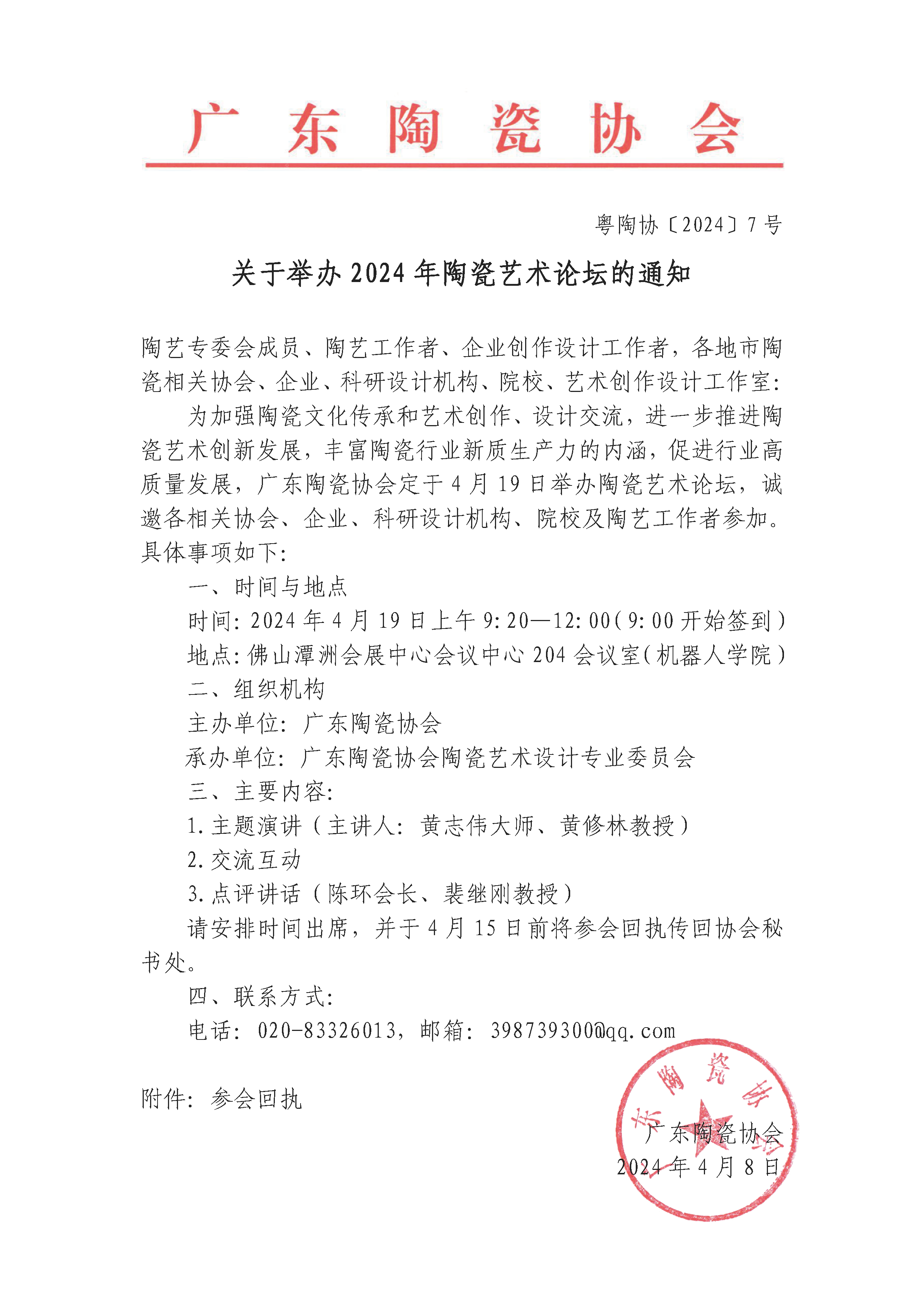 为加强陶瓷文化传承和艺术创作、设计交流,进一步推进陶瓷艺术创新发展,丰富陶瓷行业新质生产力的内涵,促进行业高质量发展,广东陶瓷协会定于419日举办陶瓷艺术论坛,诚邀各相关协会、企业、科研设计机构、院校陶艺工作者参加。具体事项如下: